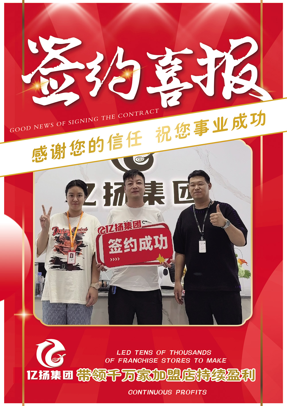 亿扬集团带领千万家加盟店持续盈利,感谢您的信任,祝您事业成功!